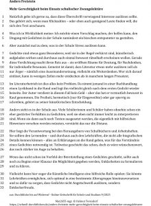 In ihm macht er Vorschläge, wie man bei Schülis das Interesse oder gar die Freude an Gedichten fördern kann – trotz mancher schulbedingter Zwänge.