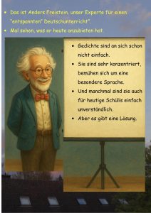 Was ich in Wirklichkeit meine: Ich möchte einen Vorschlag machen, der helfen kann, den Umgang mit Gedichten in der Schule zumindest ein bisschen entspannter zu gestalten.