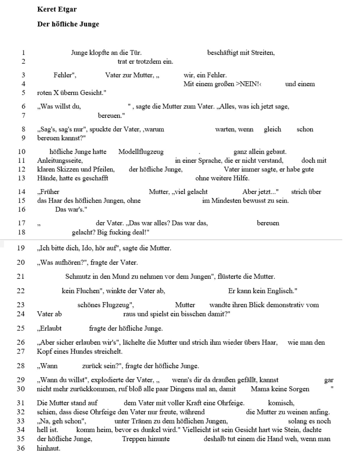 — - 1-2: sehr distanzierter Einstieg – stark zusammenfassendes Erzählen: Streit der Eltern, Junge klopft – keine Antwort – tritt trotzdem ein.
