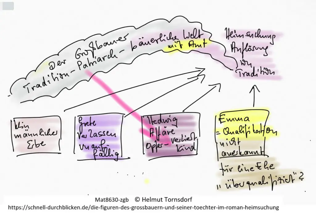 - Unten die Problemfälle: der fehlende männliche Erbe, die verlassene Tochter, also kein Schwiegersohn. Hedwig mit Affäre und „Skandal“. Emma ist qualifiziert, wird aber nicht anerkannt und erscheint den Männern für eine Ehe regelrecht überqualifiziert.
