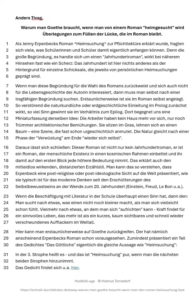 Hier kann man erstaunlicherweise auf Goethe zurückgreifen. Der hat nämlich anscheinend Erpenbecks Roman schon vorausgesehen. Zumindest präsentiert ein Teil des Gedichtes „Das Göttliche“ eigentlich die gleiche Aussage wie „Heimsuchung“: