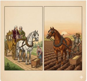 Kutschpferd ↔ Ackergaul, Vornehme ↔ Arbeitende → Verstärkung der zentralen Aussage. -