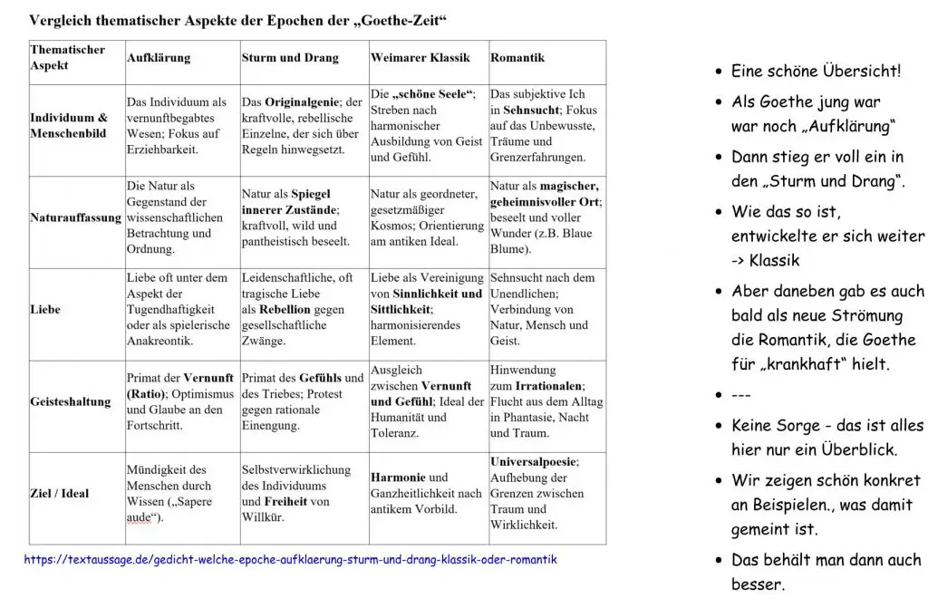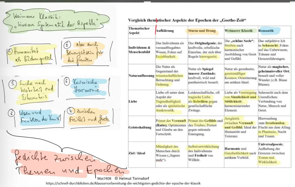 Hier ein Schaubild, das links die thematischen Gruppen zeigt. Rechts ein Überblick über die verschiedenen Epochen, die in dem Gedicht durchaus eine Rolle spielen können. Es ist nicht alles nur Klassik, was in dieser zeitlichen Epoche entstanden ist. Gelb hervorgehoben haben wir Vergleichspunkte.
