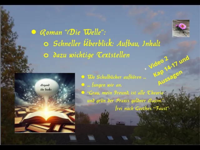Wir präsentieren hier einen schnellen Überblick über die Kapitel 14-17 des Romans "Die Welle". Außerdem fassen wir die wichtigsten Aussagen zusammen: Was zeigt der Roman?