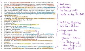 - Diskutieren könnte man die Regieanmerkungen zum Verhalten der Frau Kramer, bsd. in Zeile 31/32 und dann Zeile 42.